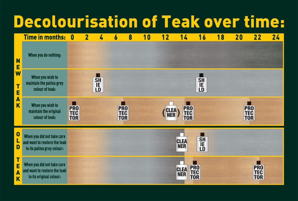 This depends on the look you prefer. If you want to maintain the original colour, treat regularly with the right Goden Care Teak Colour Protector and Shield when decolourisation starts. If you prefer the natural silver-grey look, only Golden Care Teak Shield is necessary for water- and dirt-repellency.