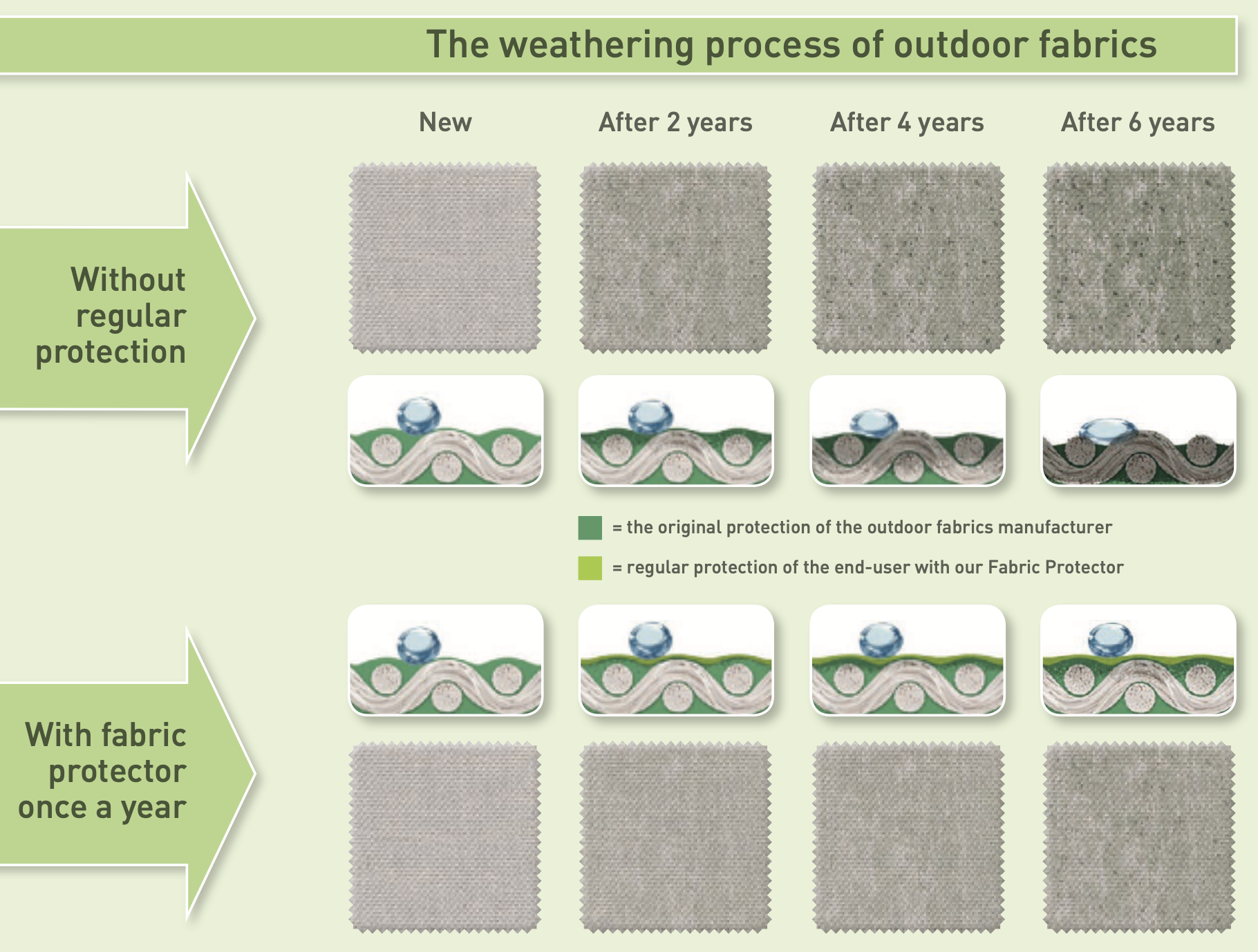 We recommend cleaning surfaces whenever they look dirty or stained. Further, does it depend on how intensively the furniture is used and how exposed it is to weather. Generally, we advise applying Golden Care Fabric Protector at least once a year, or more often if subject to harsh weather conditions.